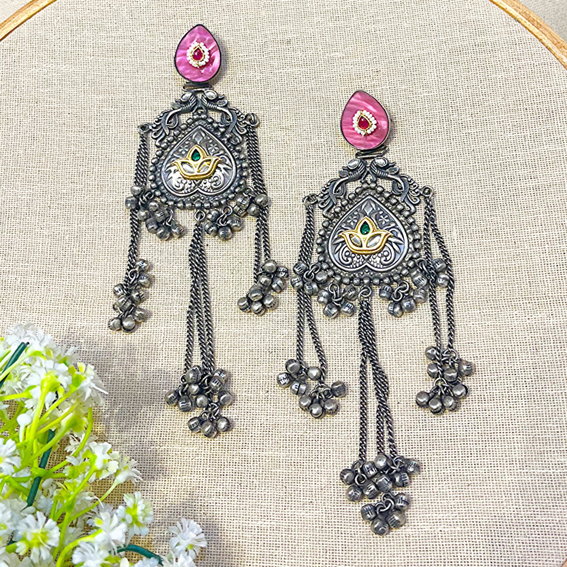 Make a stunning traditional statement with these oxidised long ghungroo earrings featuring oxidised silver finish, pink/magenta teardrop enamel stone with white/clear pearl border and red/pink circular stone in center, oxidised silver teardrop-shaped panel with intricate filigree/scroll border pattern, golden lotus/floral motif with green teardrop stone in center, small oxidised silver ghungroo/bell clusters hanging from sides, multiple long oxidised silver chains, multiple oxidised silver ghungroo/bell clusters at bottom, and push back with stopper closure. Perfect for traditional wear and festive occasions with authentic Indian craftsmanship.