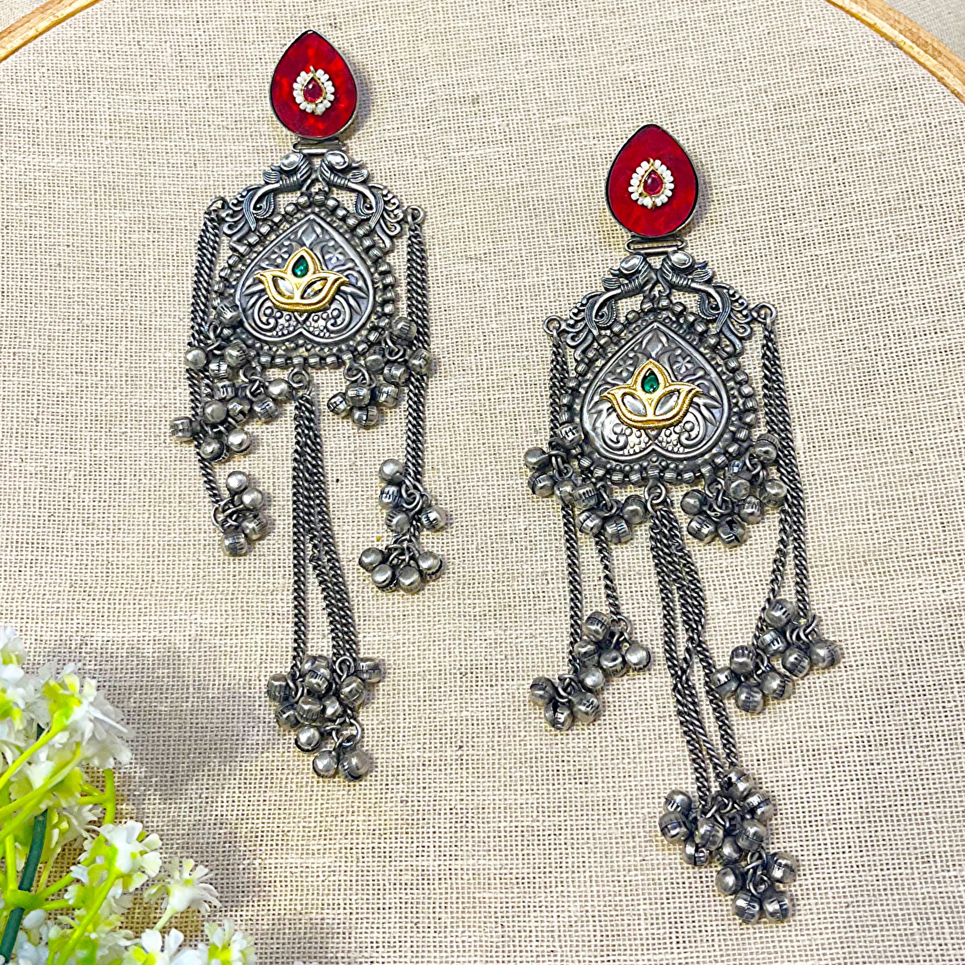 • Design: Long ghungroo earrings with lotus motif and chains