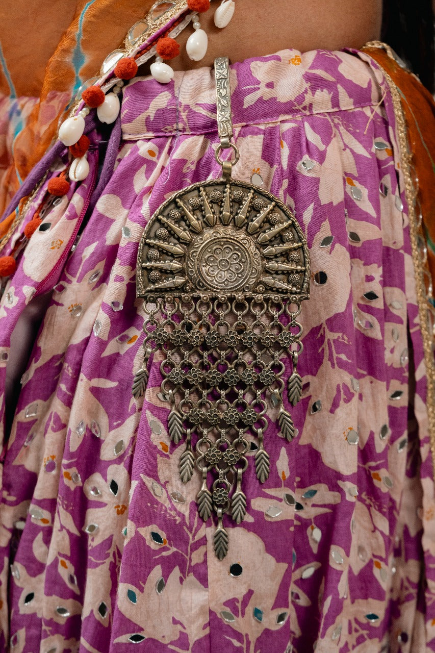 The Cirac silver look alike juda features breathtaking traditional design with oxidised silver finish. Oxidised silver rectangular engraved connector/bail with hanging loop sits on top for elegant detail. Large oxidised silver semi-circular/arch shaped medallion showcases intricate sunburst/radiant design for ornate appeal. Multiple pointed spike/ray elements radiate outward from center for refined structure. Small oxidised silver ball beads sit at tips of each ray for luxurious focal point. Raised circular floral rosette in center features petal pattern for graceful finishing. Scroll/vine engraved border runs along curved top edge for dramatic effect. Multiple oxidised silver chain links connect to decorative elements in first fringe row. Oxidised silver floral/flower motifs with leaf elements hang from chain links in second fringe row. Larger oxidised silver floral/flower motifs with leaf dangles create third fringe row. Single large oxidised silver floral/flower motif with multiple oxidised silver leaf/feather dangles completes the design at bottom. At 110 grams with 26 cm length, this statement juda is perfect for Navratri, traditional wear, and grand festive occasions. Pair with traditional lehengas, chaniya choli, or festive ensembles for stunning styling.