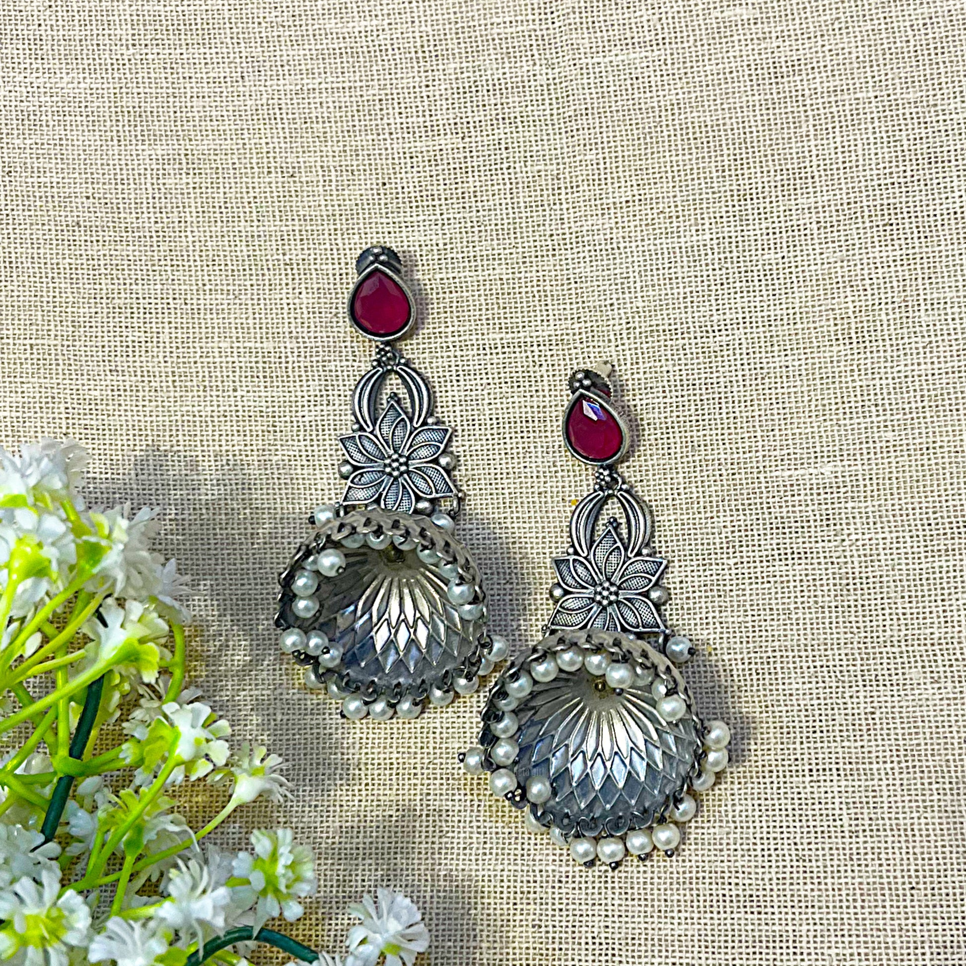 Make a stunning traditional statement with these elegant silver look alike oxidised earrings for women featuring oxidised silver finish with turquoise/teal green teardrop stone in oxidised silver setting on top, oxidised silver lotus/floral motif with intricate petal details and filigree pattern, large oxidised silver jhumka/bell dome with radial/sunburst engraved pattern, oxidised silver bead/ball cluster border at rim, Ahmedabadi stones, and push back with stopper closure. These traditional oxidised jhumka earrings for weddings showcase authentic Indian craftsmanship, perfect for festive and ethnic occasions.