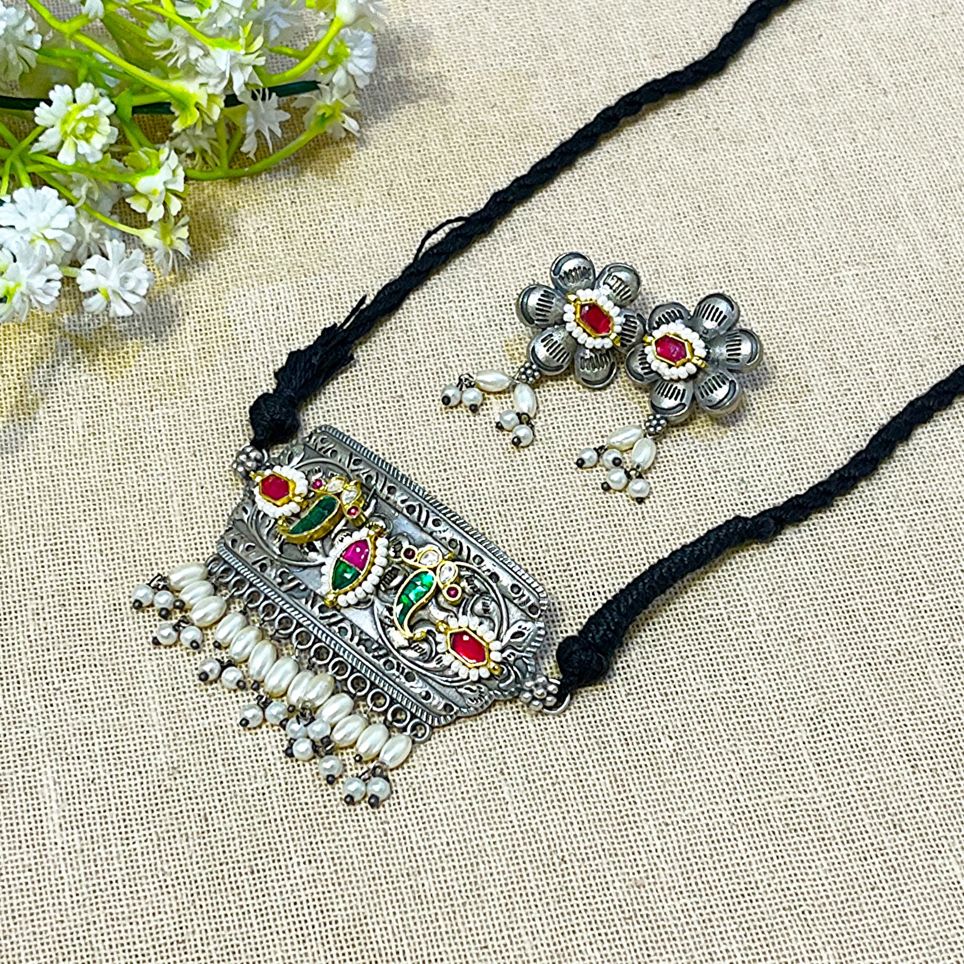 The Flint kundan choker features elegant traditional design with oxidised silver finish. Large rectangular pendant showcases intricate scroll/filigree patterns. Colorful enamel peacock/floral motifs feature multicolored Ahmedabadi kundan stones (red/pink, green, yellow) for vibrant appeal. Multiple white pearl drops hang from pendant bottom for graceful movement. Matching floral earrings feature red/pink kundan centers and pearl drops. Black adjustable string/dori provides comfortable fit. At 52 grams with adjustable string closure, this statement choker set is perfect for weddings and festive occasions. Pair with traditional outfits, ethnic wear, silk sarees, or festive ensembles for elegant styling.