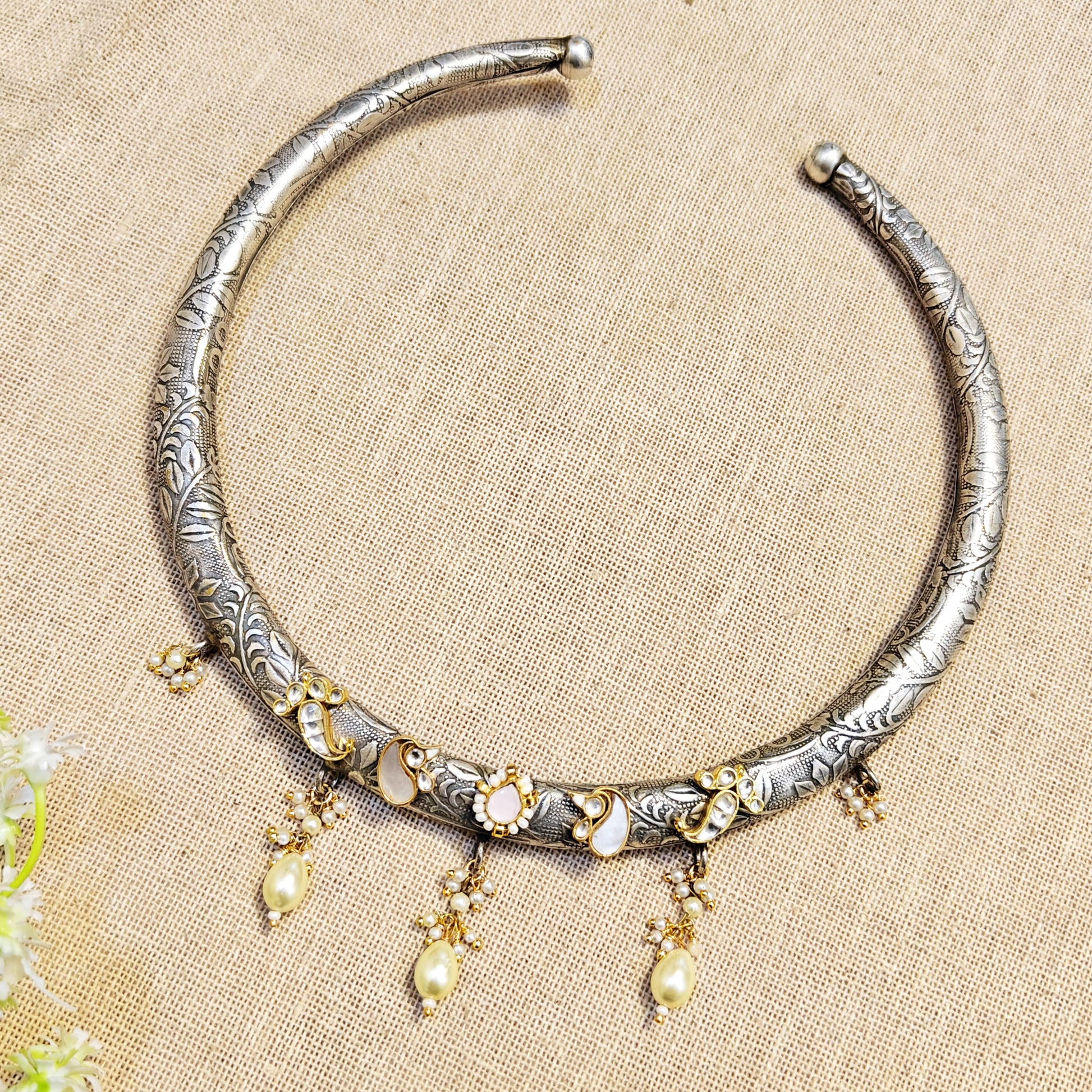 The Fusey hasli showcases exquisite craftsmanship with detailed floral patterns etched along the oxidised silver band. The center piece features white kundan stones with gold-tone accents and elegant pearl drops that add movement and grace. This fusion design is remarkably lightweight at 88 grams, offering comfortable wear while maintaining a statement presence. The adjustable opening ensures a perfect fit for all-day celebrations.
