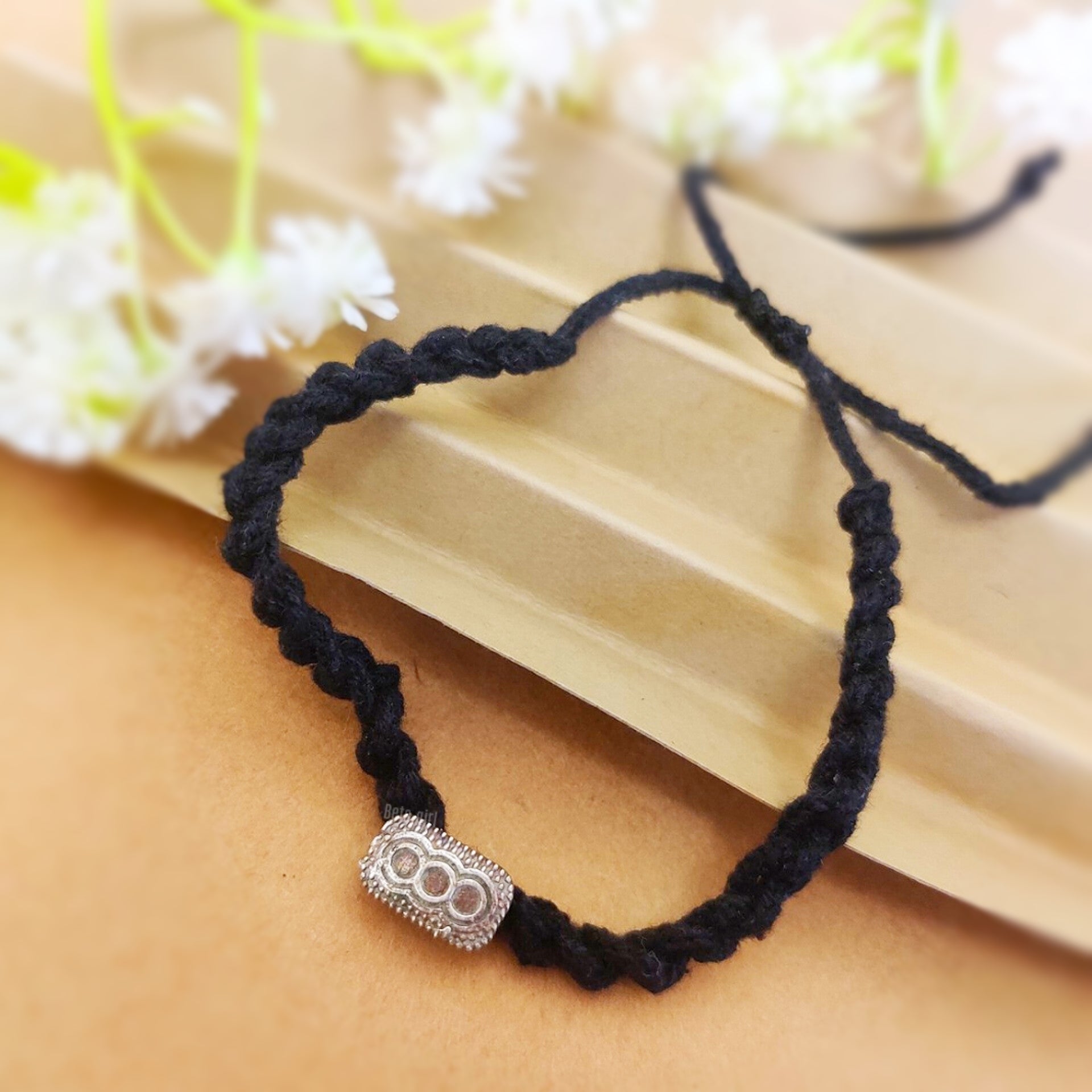 The Infiaz silver nazariya thread anklet features stunning everyday design with oxidised silver finish. Black braided/macramé cotton thread showcases flat braid/weave pattern for elegant detail. Adjustable sliding knot closure with long tail ensures comfortable fit for all ankle sizes. Oxidised silver rectangular/barrel shaped bead threads directly onto the thread band for ornate appeal. Three circular recessed/concave rings in a row on face create refined structure. Intricate beaded/dotted granulation border runs along all four edges for luxurious focal point. At 3 grams, this lightweight statement anklet is perfect for casual wear, office wear, and everyday occasions. Pair with ethnic wear, cotton sarees, kurtas, or casual ensembles for stunning styling.