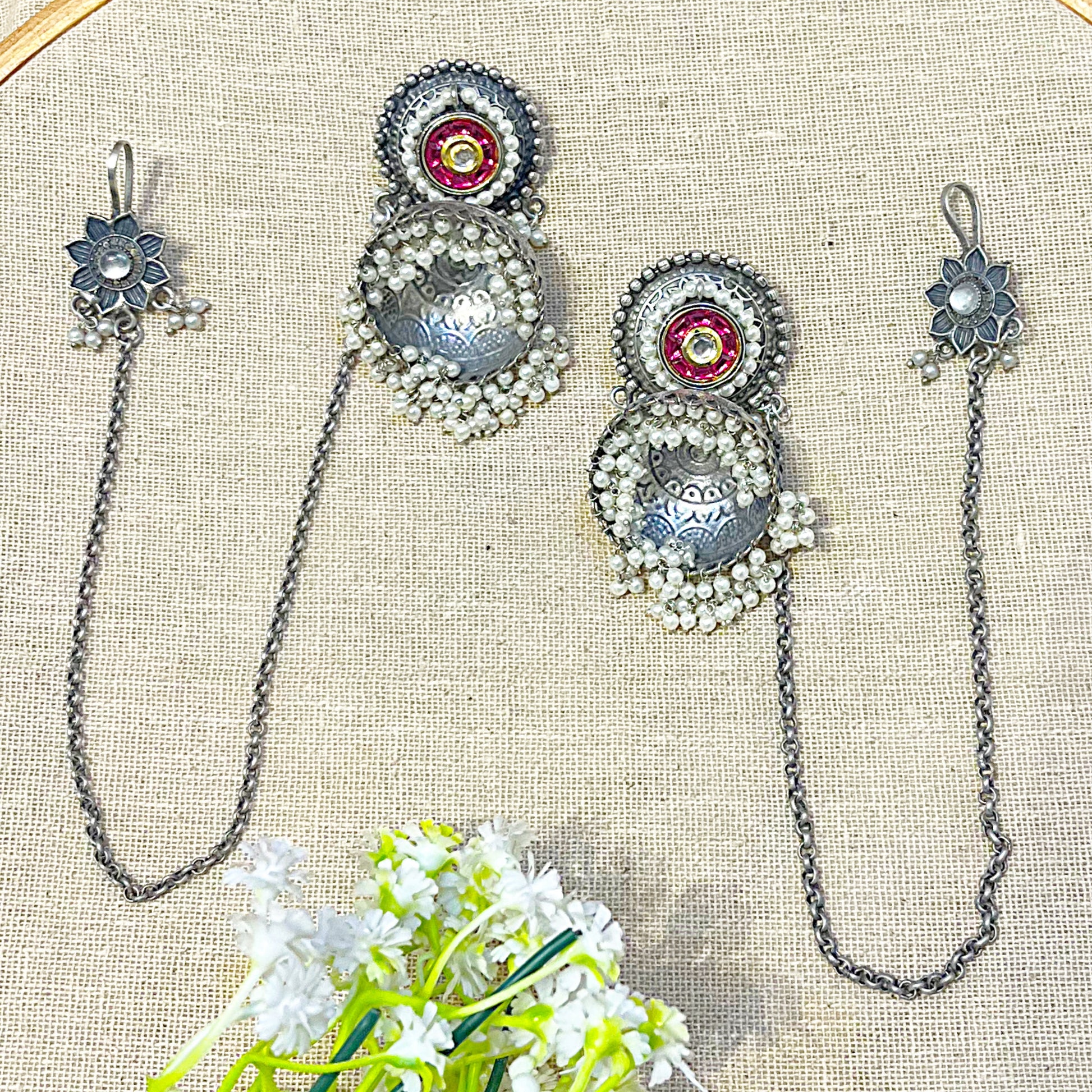 Make a stunning traditional statement with these exquisite silver look alike oxidised earrings for women featuring oxidised silver finish with floral motif ear hook, long oxidised silver chain connecting hook to jhumka, oxidised silver circular disc with white/clear pearl border and red/pink enamel center with golden/yellow circular stone, oxidised silver dome with white/clear pearl cluster border and engraved pattern, large oxidised silver jhumka/bell dome with white/clear pearl cluster border, Ahmedabadi kundan stones, and push back with stopper closure. These traditional oxidised earchain earrings for weddings showcase authentic Indian craftsmanship, perfect for festive and ethnic occasions.
