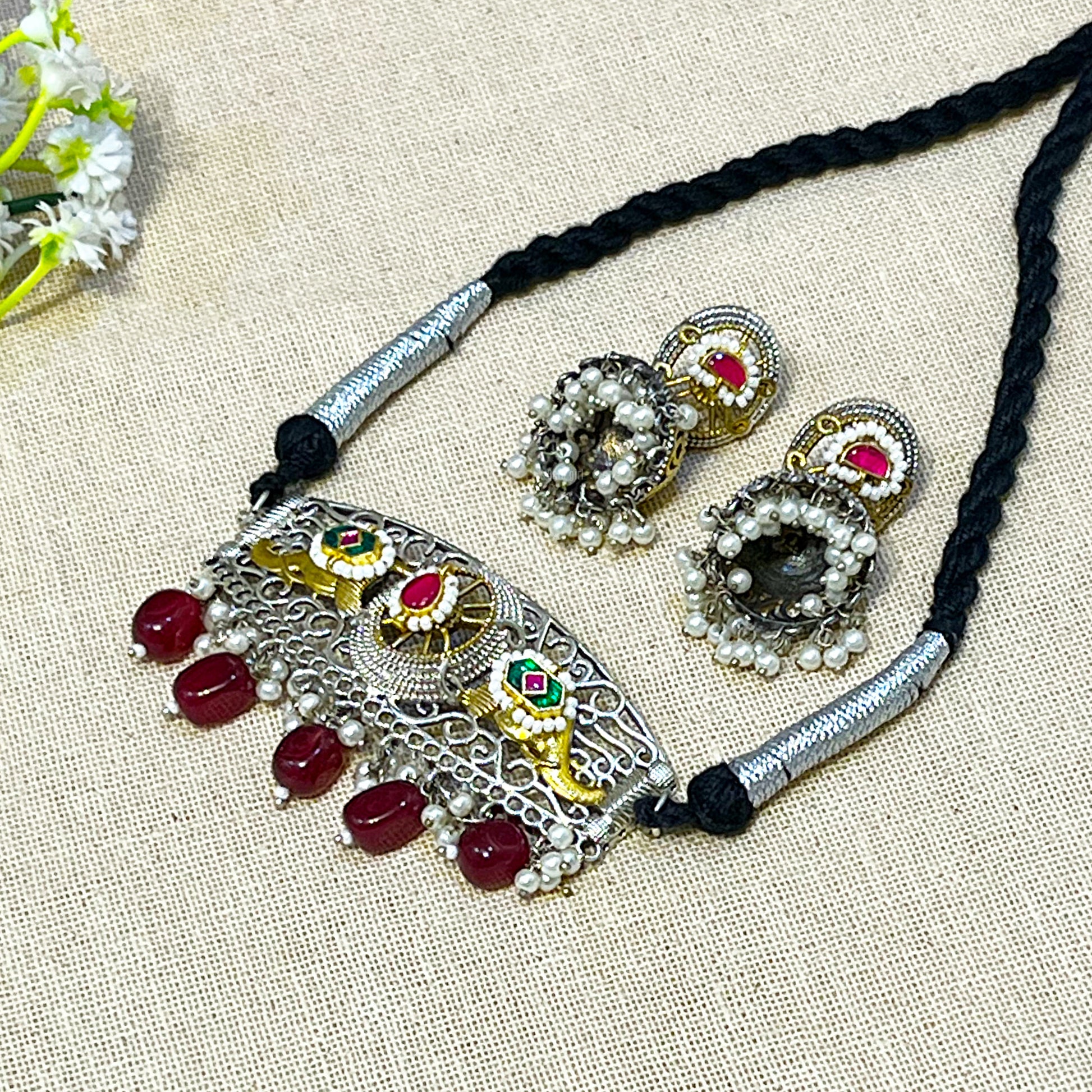 Make an opulent bridal statement with this kundan enamel pendant choker set featuring oxidised silver finish, rectangular filigree pendant with intricate scroll patterns, colorful enamel peacock/floral motifs with multicolored Ahmedabadi kundan, five deep red/ruby drops, and matching earrings with pearl clusters. Perfect for weddings and grand celebrations with authentic Indian craftsmanship.