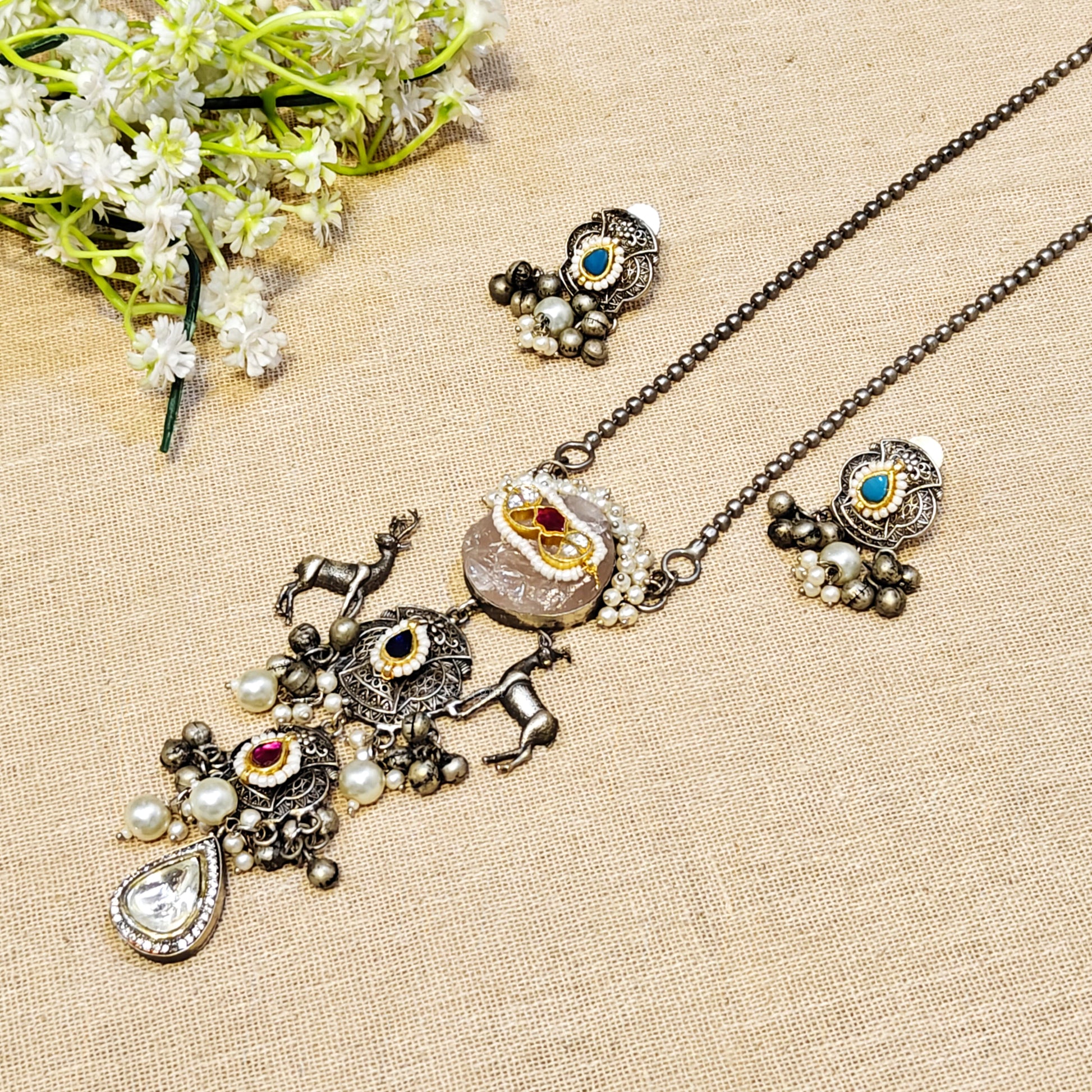 The Sahahi necklace set showcases exquisite traditional craftsmanship with detailed peacock designs adorned with blue, red, and yellow stones, complemented by delicate pearl accents. The oxidised silver finish creates a vintage, bohemian charm that's both elegant and eye-catching. Despite its ornate appearance, this set is lightweight at just 76 grams, ensuring comfortable wear throughout festive celebrations and wedding functions.