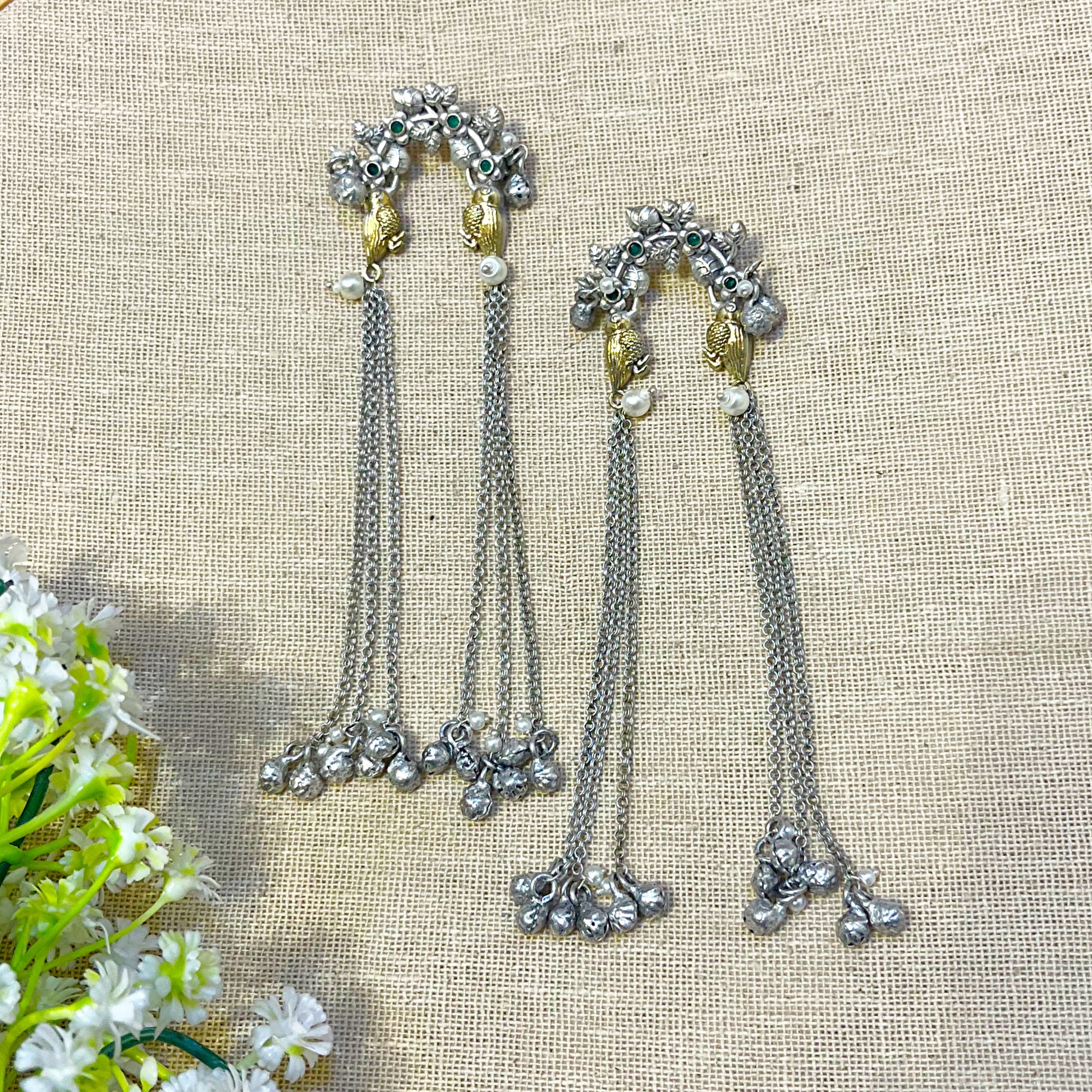 Make a stunning traditional statement with these exquisite silver look alike long earrings for women featuring oxidised silver finish with floral cluster top with green/turquoise stones and white/clear pearls, golden fish/leaf motifs on both sides, white/clear pearl beads, multiple long oxidised silver chains cascading down, oxidised silver floral cluster in middle with green/turquoise stones and white/clear pearls, multiple oxidised silver floral clusters with green/turquoise stones and white/clear pearls at bottom for graceful movement, artificial stones, and push back with stopper closure. These traditional long earrings for weddings showcase authentic Indian craftsmanship, perfect for festive and ethnic occasions.