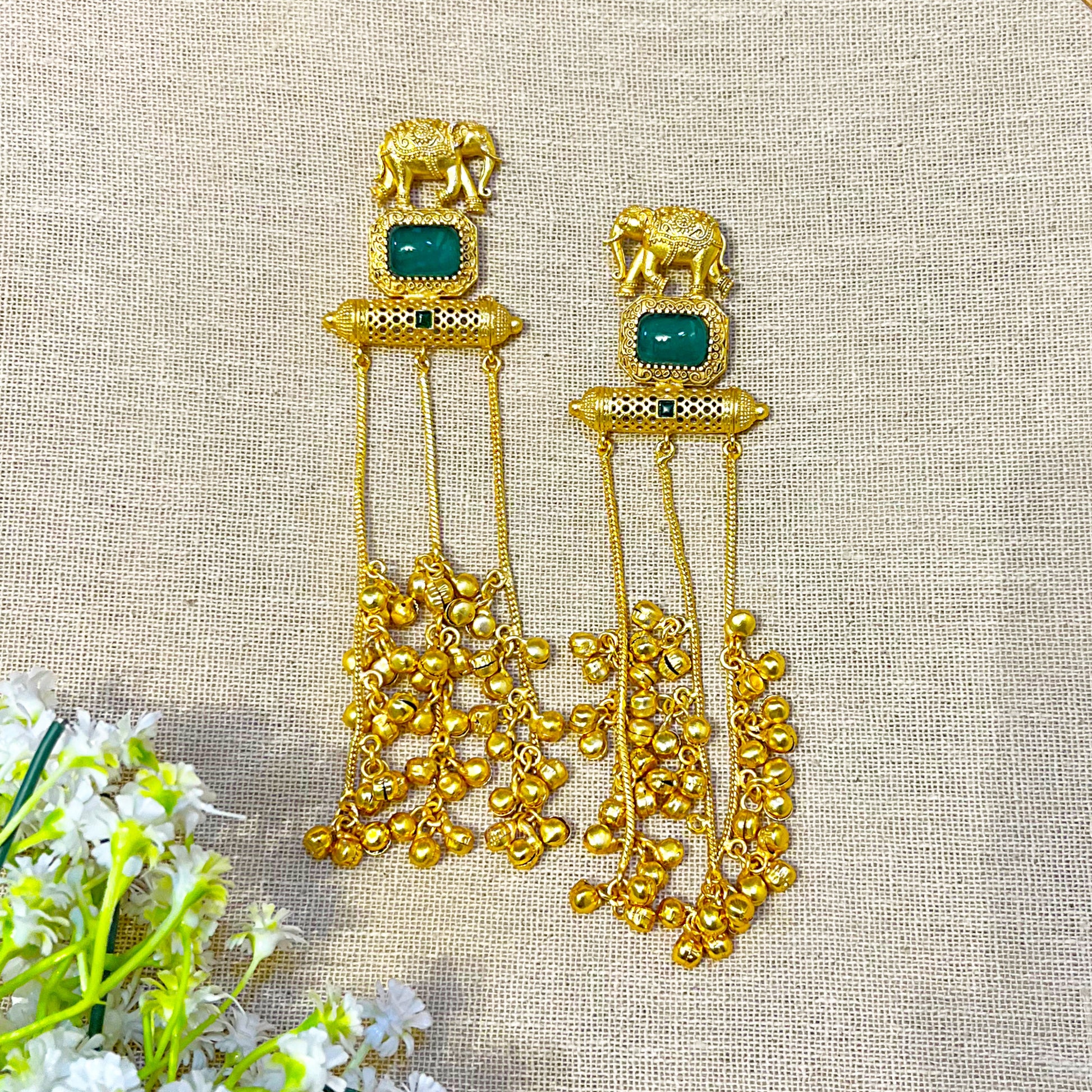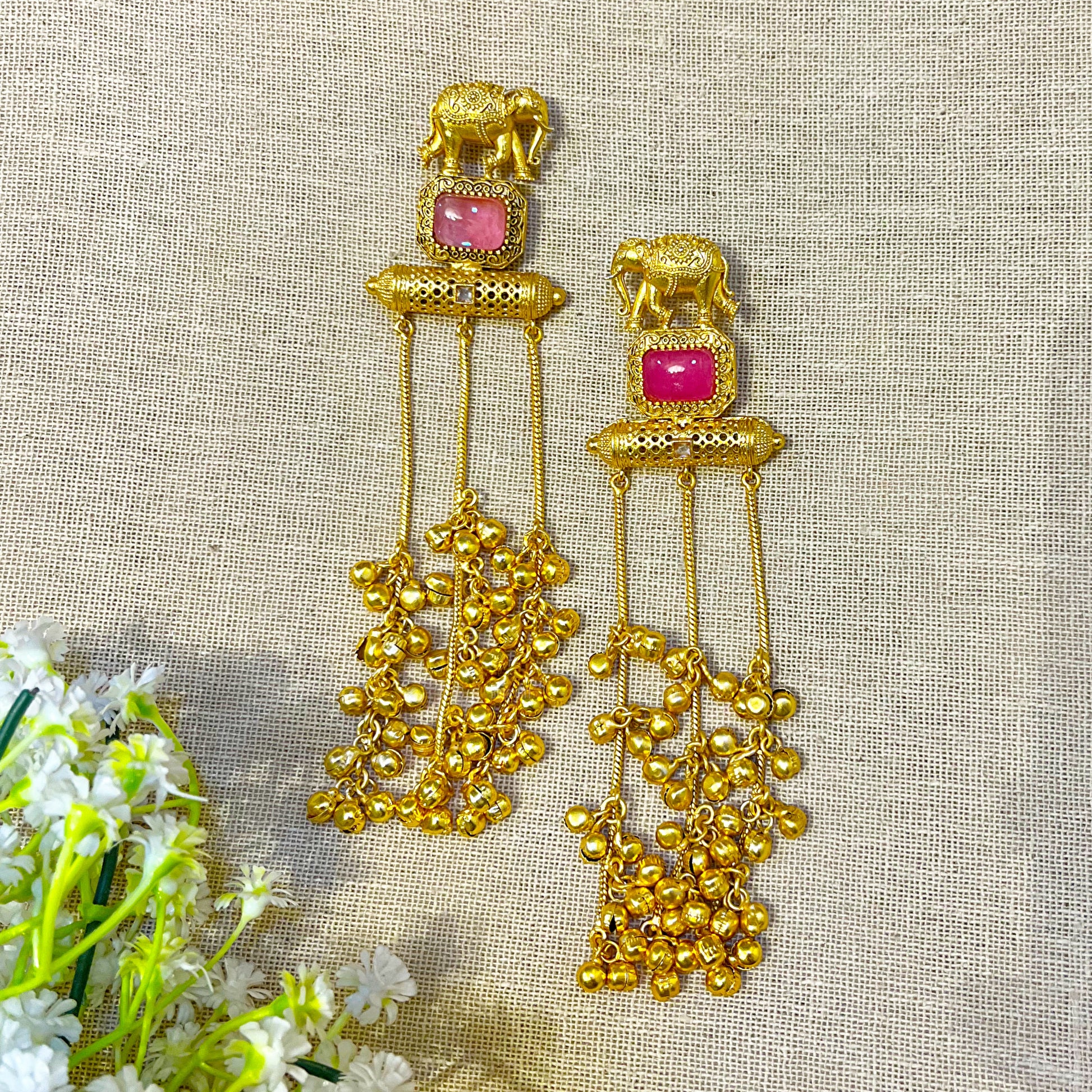 • Design: Long earrings with elephant motif, chain, and ghungroo drops