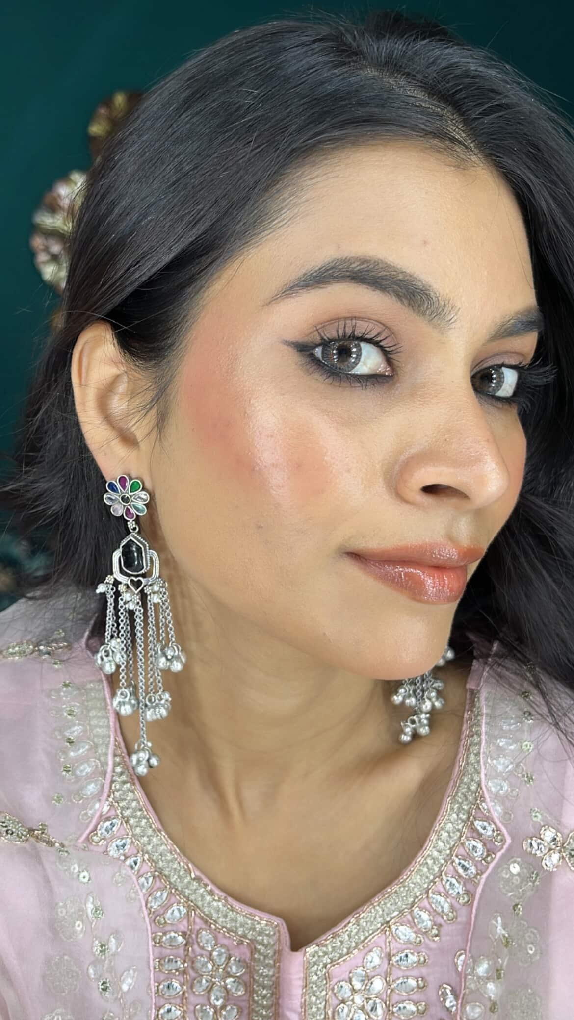• Design: Long earrings with floral motif, green stone, and bead drops