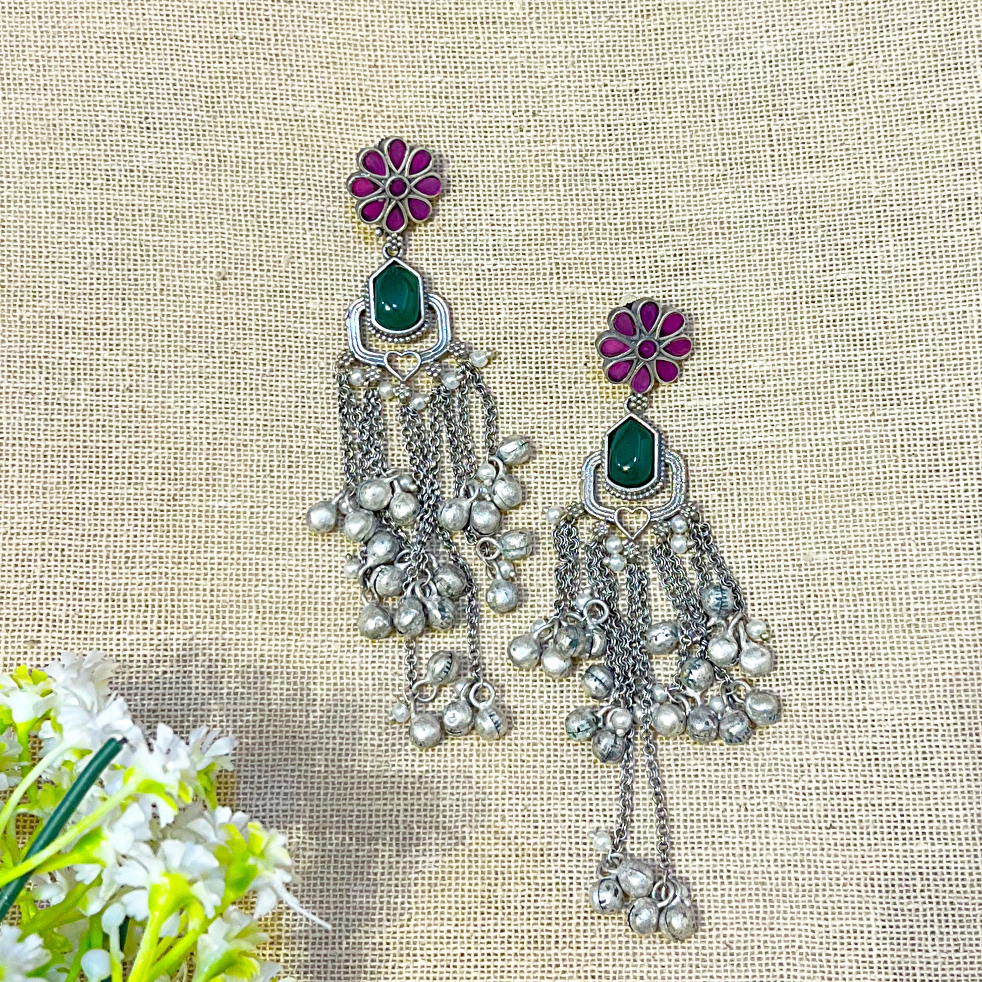 Make a stunning traditional statement with these silver look alike oxidized earrings featuring oxidised silver finish, purple/magenta enamel floral motif stud top with multiple petals, green oval stone in oxidised silver ornate setting with scroll/paisley details, multiple oxidised silver chains, white/clear crystal/glass beads and gray/silver beads attached along chains, and push back with stopper closure. Perfect for traditional wear and festive occasions with authentic Indian craftsmanship.