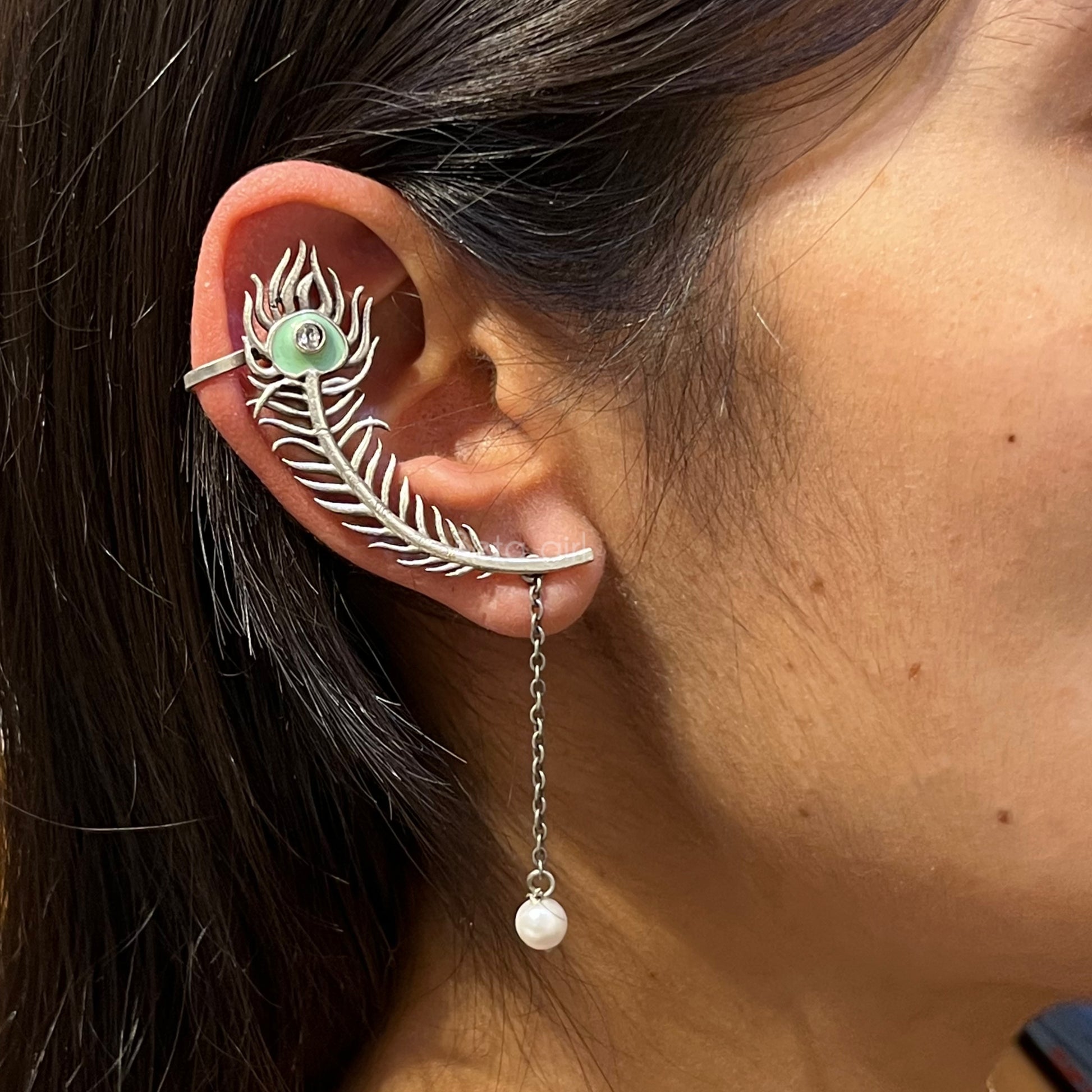 • Design: Peacock feather earcuff with chain and pearl drop